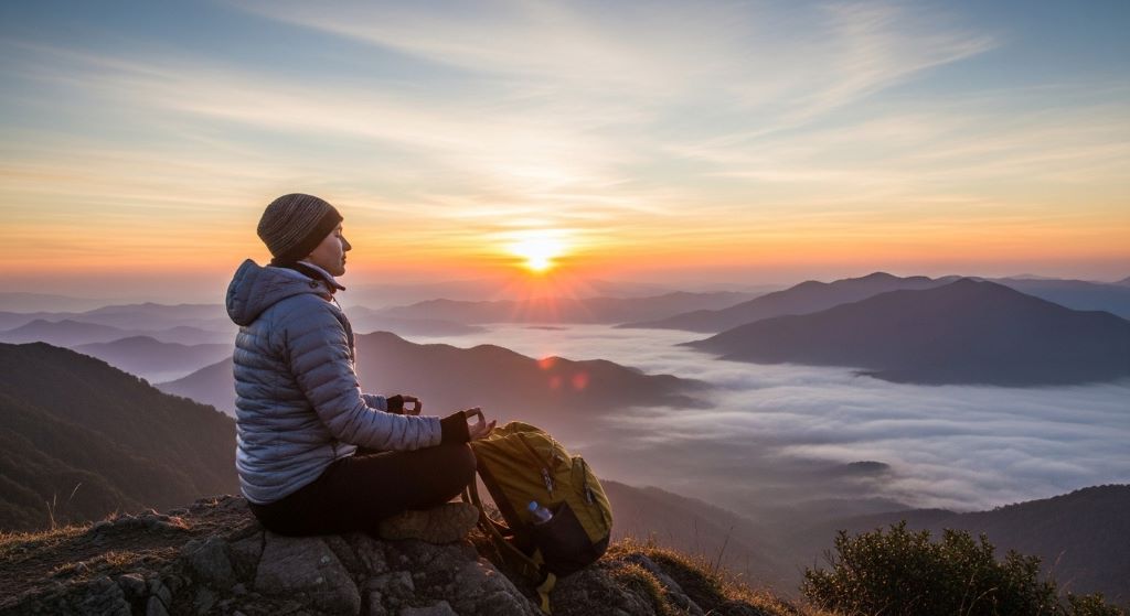 Traveler meditating peacefully at sunrise on a mountain overlooking misty valleys during mindful heartbeat tour